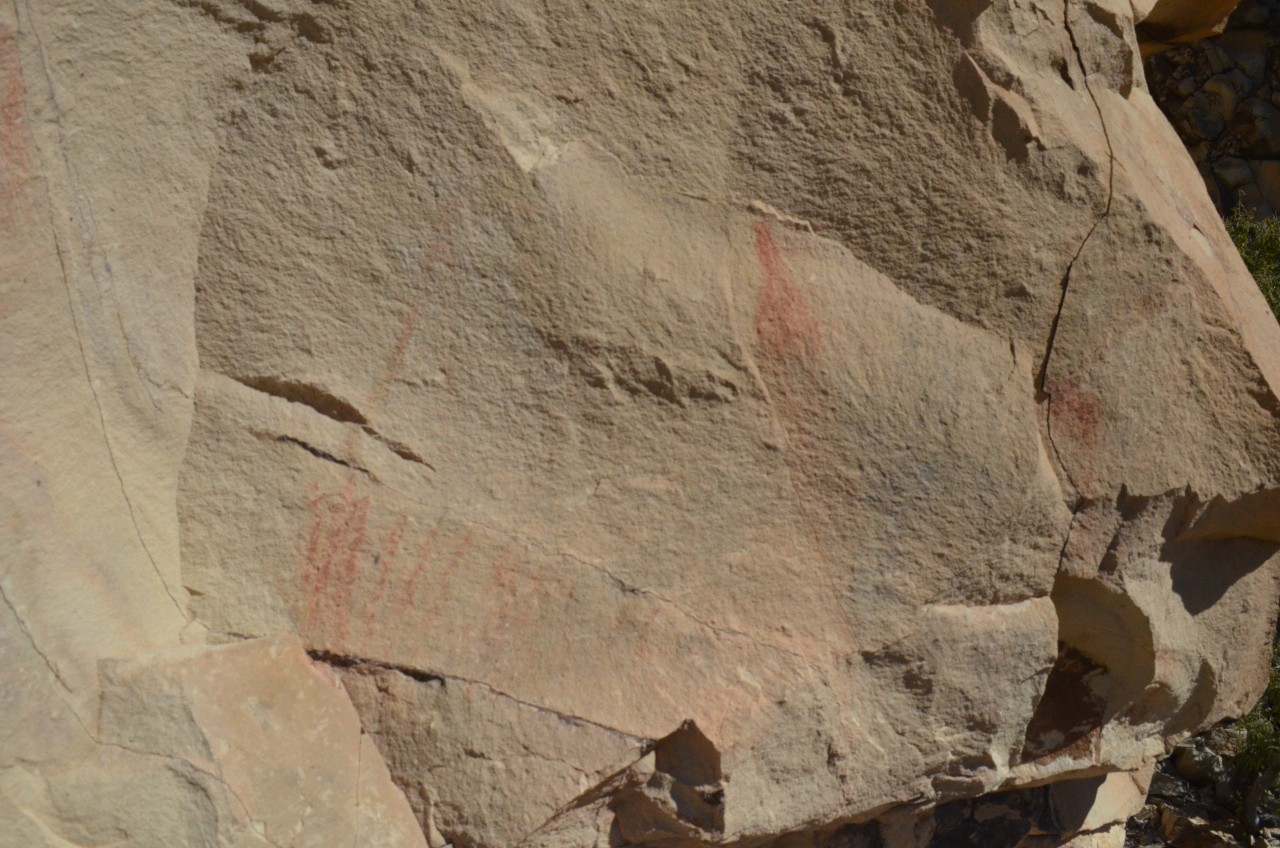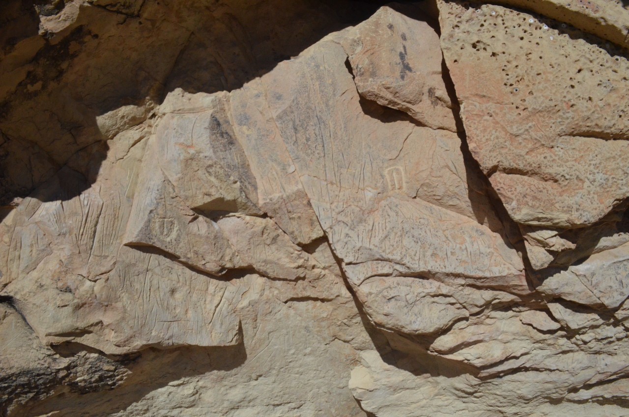 As you approach the line of stone structures known as the Chimneys, you see one standing off to the left (or south) all by itself. This is where you will find the rock art. The main panel is a fairly large and has a number of petroglyphs. As you explore around the base of the structure, you will find a few faint pictographs as well. Here are some of the photos I took of the site and the rock art on my visit.