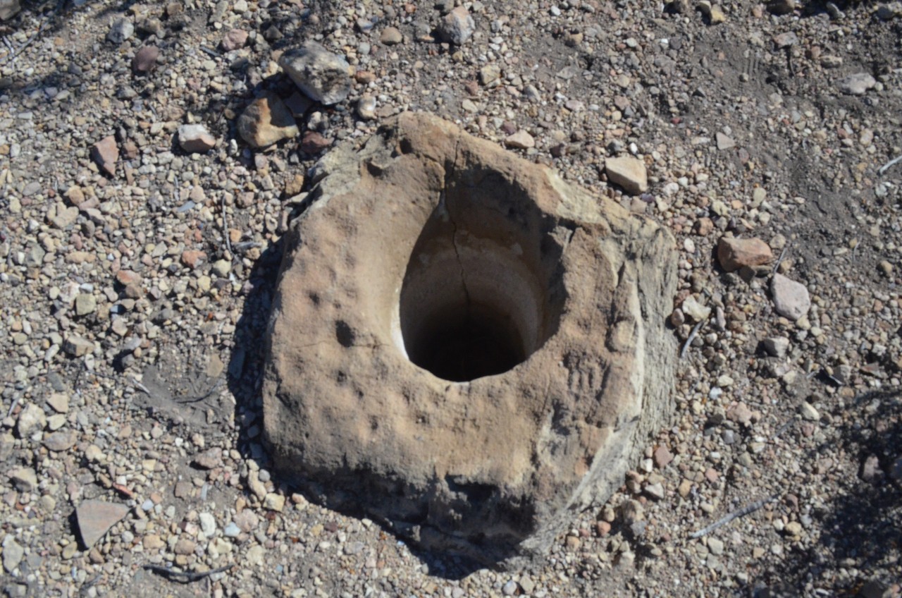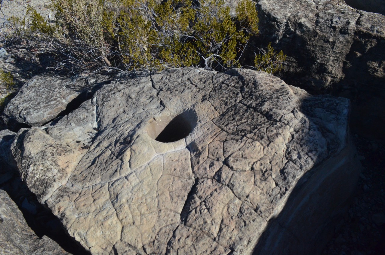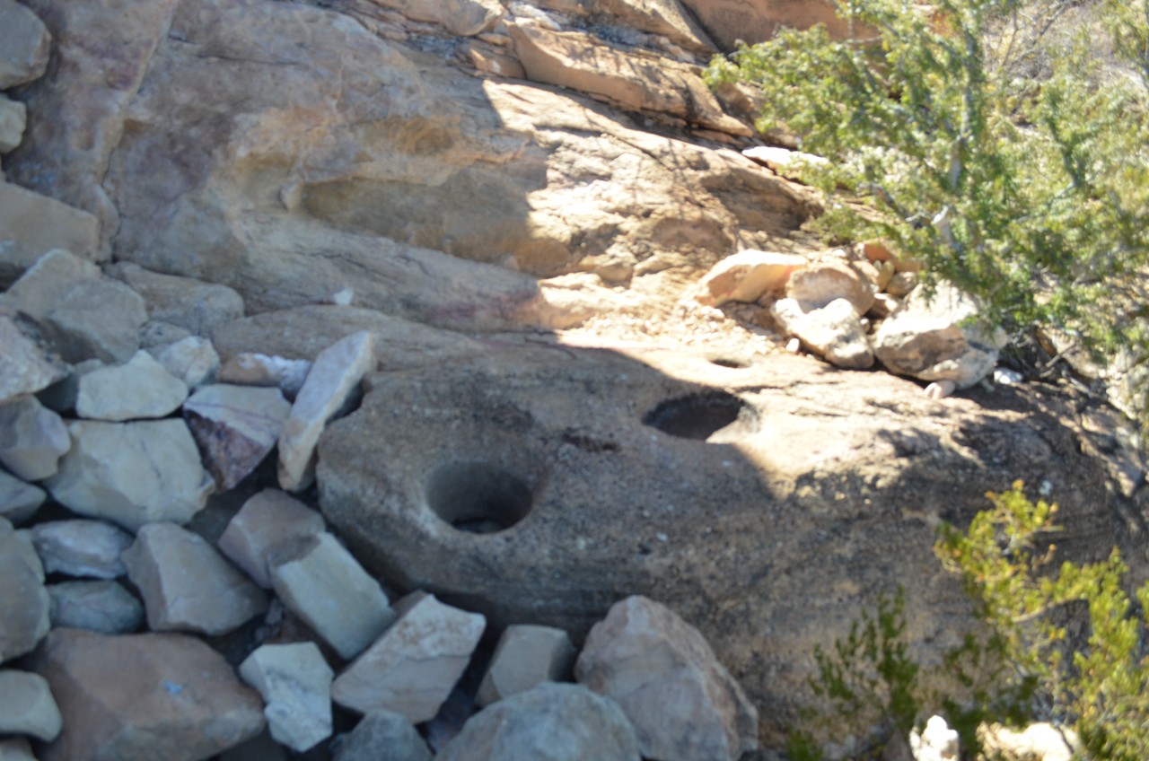 There are a surprising number of bedrock grinding holes, cupules, and a few metates at the Chimneys Site. Here are a few photos.